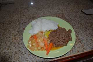Palache as it is called in Botswana is similar to polenta except it is cooked to be a little stiffer. It is normally served with meat, usually beef or goat and sautéed leafy green vegetables. I like to improvise, so instead of running to the store to get the necessary ingredients, I used what I had on hand, ground beef and cabbage. It was simple, quick and finger licking good (the meal is traditionally eaten with your hands BUT, if you are like my Dad, you dine with a knife and fork, no matter what J).