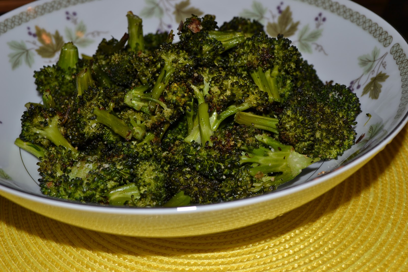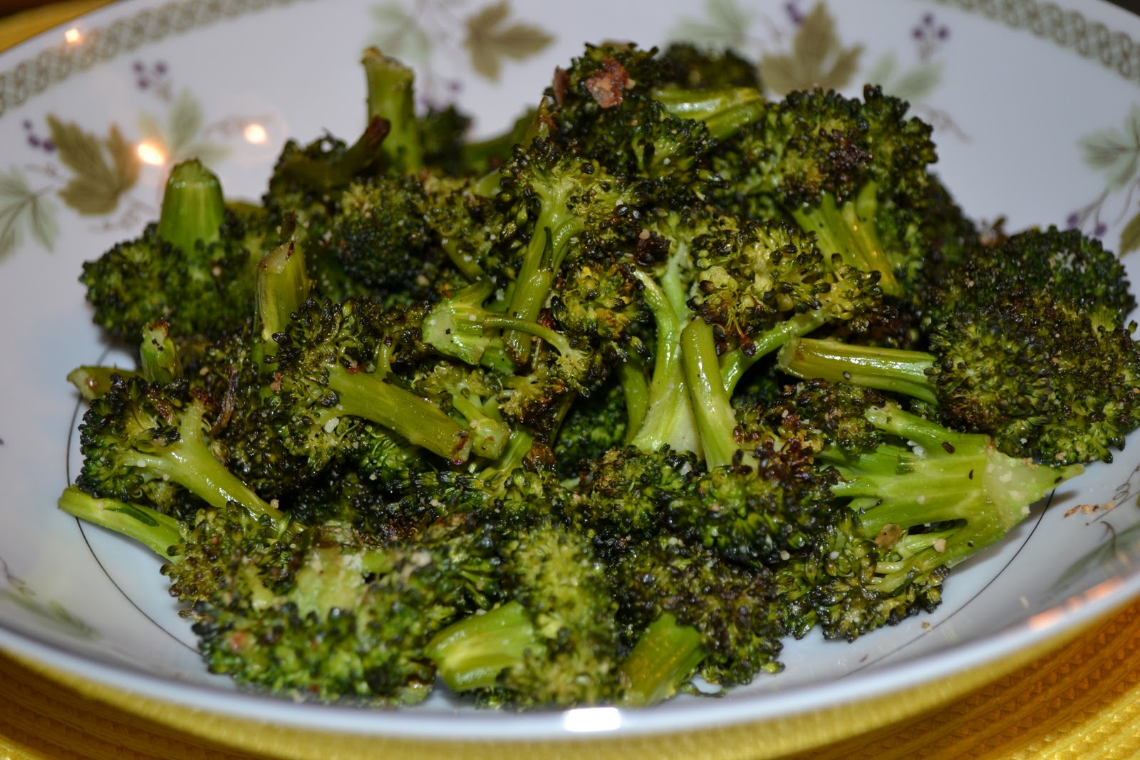 Place the broccoli in a shallow baking dish and bake for 15 – 20 minutes until broccoli is slightly brown and crispy (check frequently to make sure it does not burn)