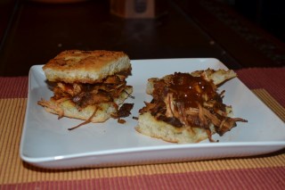 If you are like me, you enjoy being creative with leftovers. I made these petite pork sandwiches a couple of days after I made the crockpot ribs (click here for recipe) and have just gotten around to submitting a post. Since I used boneless ribs, it was easy to pull the pork apart. For the bread I used the flat bread I bought from Costco. Yes, it freezes well! I took it out of the freezer in the morning and by evening it was thawed out. Feel free to use the bread of your choice.