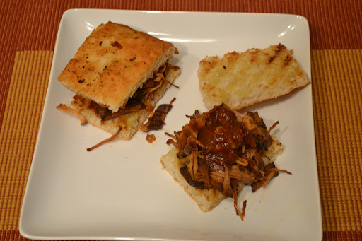 Reheat pork, pull apart with a fork. Place about two tablespoons of pulled pork on top of one side of the bread, add about a tablespoon of barbecue sauce (you should have some sauce from the barbecue pork) on top of pork place other half of bread on top and voila, you are ready to indulge!
