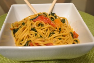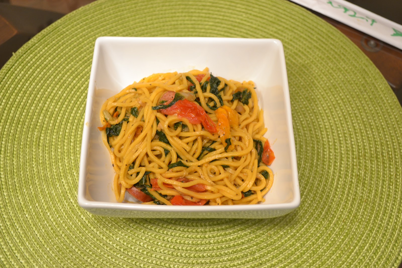 There is a local grocery store in my town that has fresh fruit and vegetables, fish and an array of international goods. I was strolling through the store today trying to figure out what to make for lunch. I knew I wanted a green leafy vegetable but was not sure which one. There was fresh spinach, kale, bok chow, swiss chard, mustard greens, collard greens, beet leaves etc. I settled on the swiss chard which I normally sauté with onions and garlic however, as I was headed to the checkout I spotted chow mein noodles and wondered how the two would taste together. I must say I was pleasantly surprised. I love the flavor of swiss chard but if you find it too strong, you can substitute it with spinach or any green leafy vegetable of your choice.