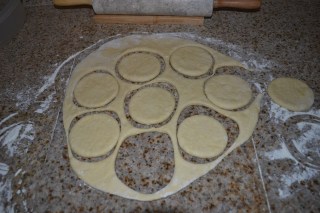 Flour the top of a large drinking glass and use glass to cut circles in the dough (if you would like larger bakes, use rolling pin to roll out the portions a bit more- don’t make too thin)