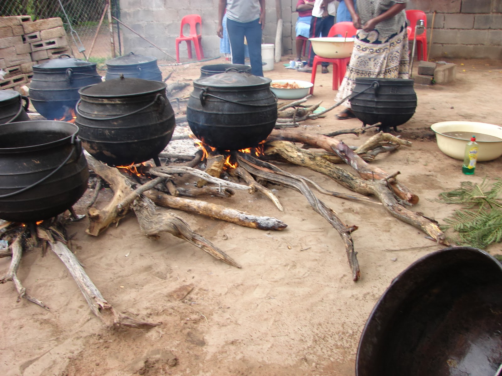 Seswaa is traditionally prepared for large gatherings and cooked outdoors, on a wood fire and in a three legged cast iron pot. The scene would be something like this: