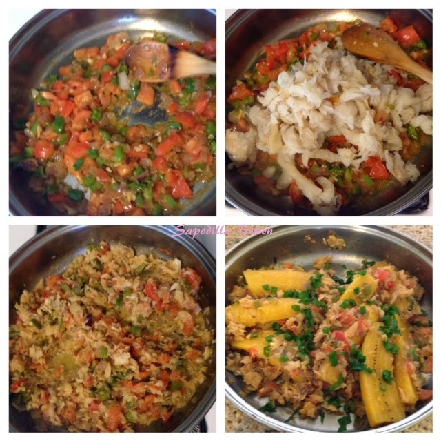 Add plantains to pan and gently combine all the ingredients so that the plantain is coated with the fish, onions, tomatoes etc.